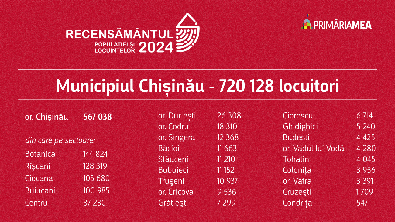 Populația capitalei a crescut cu aproape 17% în ultimii 10 ani, ajungând la peste 720.000 de locuitori. Potrivit datelor recensământului din 2024, Chișinăul crește, în timp ce celelalte raioane se depopulează. În capitală locuiesc aproape 30% din populația țării.